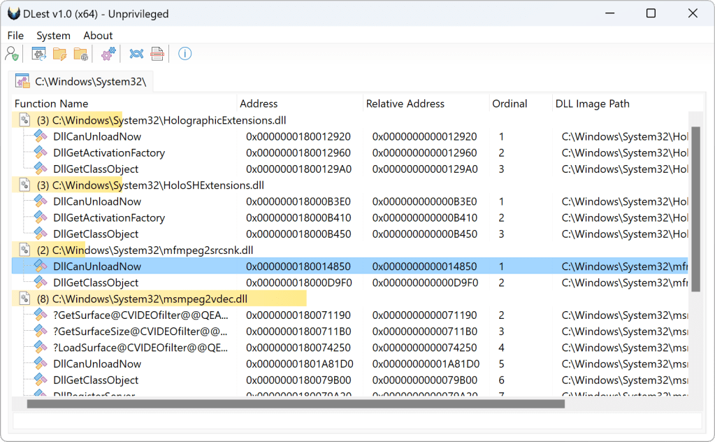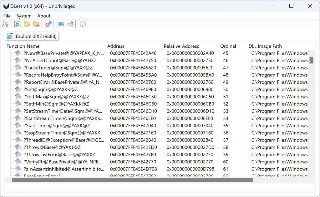 Il caricamento dalla modalità Processo in esecuzione di DLest consente di analizzare l’intestazione PE (Portable Executable) per le funzioni esportate direttamente da moduli in memoria, piuttosto che dai file archiviati su disco. Questa funzionalità può giovare a tutti coloro a cui occorre analizzare funzioni esportate in tempo reale o che hanno necessità di lavorare con moduli caricati in memoria che non sono archiviati su disco.