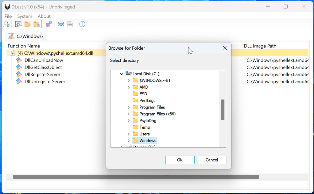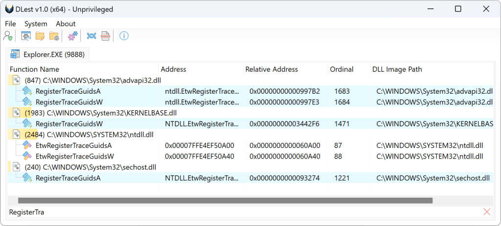 DLest è un’applicazione freeware utilizzabile per individuare le funzioni esportate nei file PE (Portable Executable), in particolare in file DLL. Con DLest è facile enumerare le funzioni utilizzando una varietà di metodi, tra cui il trascinamento della selezione, l’apertura di una cartella o la scansione ricorsiva di un folder sfruttando i filtri delle espressioni regolari, ad esempio per includere solo i PE con specifici nomi di funzioni di esportazione.
