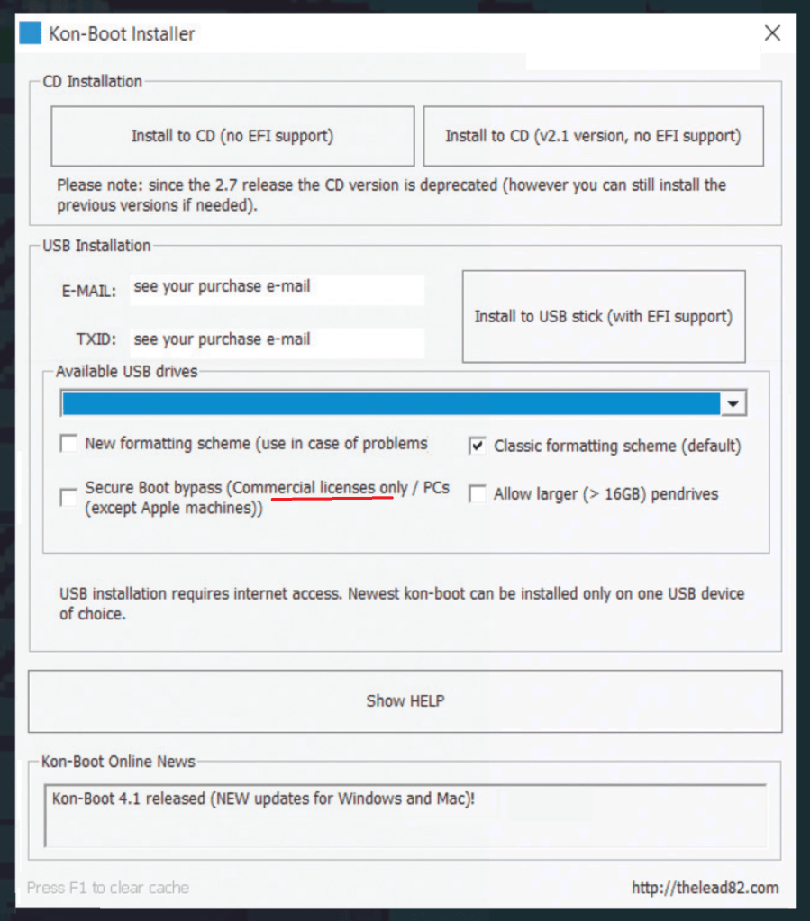 Per l’uso di Kon-Boot è necessaria una pendrive con almeno 16GB di spazio libero, e l’accesso a Internet per procedere all’installazione. L’autore dichiara che Kon-Boot non funziona con tablet o dispositivi Surface (su cui sono installati s.o. multipli) né su VM. Per Apple, invece, risultano supportati solo le versioni a 64bit, ma non i Mac OS X con M1 (per maggiori dettagli puoi consultare il portale ufficiale https://kon-boot.com)
