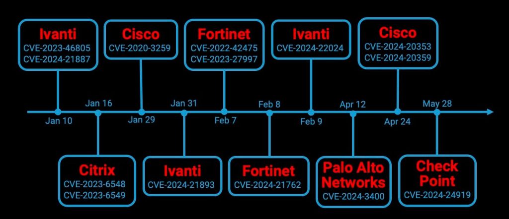 Bollettini di sicurezza informatica (CVE) riguardanti vulnerabilità intrinseche in VPN realizzabili tramite appliance (Fortinet, PAN, CheckPoint, Cisco) piuttosto che tramite software di terze parti (vedi Ivanti) tra il 2023 e il 28 maggio 2024: spaventoso.