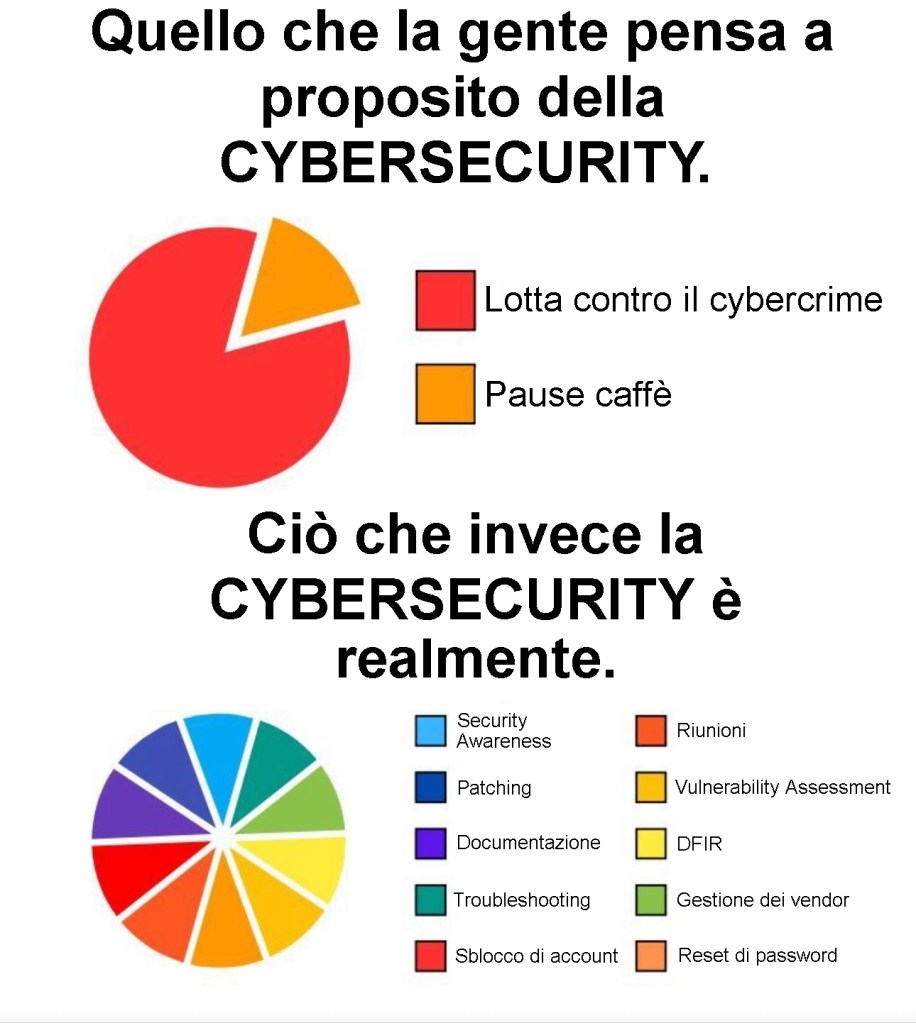 Certo, i confini e le proporzioni delineate nel grafico a torta in basso non sono e continueranno a non essere mai così nette e definite in nessuna organizzazione, ma globalmente questa infografica delinea a grandi linee il bias cognitivo di molta gente a proposito di ciò che si pensa sia dietro la sigla CYBERSECURITY (vero e proprio Leitmotiv professionale dei nostri tempi), rispetto alle problematiche attuali di cui la CYBERSECURITY è realmente costituita… ed appunto, il grafico in basso è indubbiamente una rappresentazione del settore meno sbrigativa e meno superficiale rispetto a quella illustrata nel primo grafico, ossia da quelle ipocrite rappresentazioni con cui il mainstream continua a beffare tantissimi non addetti ai lavori.